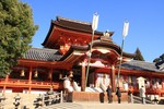 真新しくなった朱塗りの社殿が冬の青空とマッチして美しく輝いています。