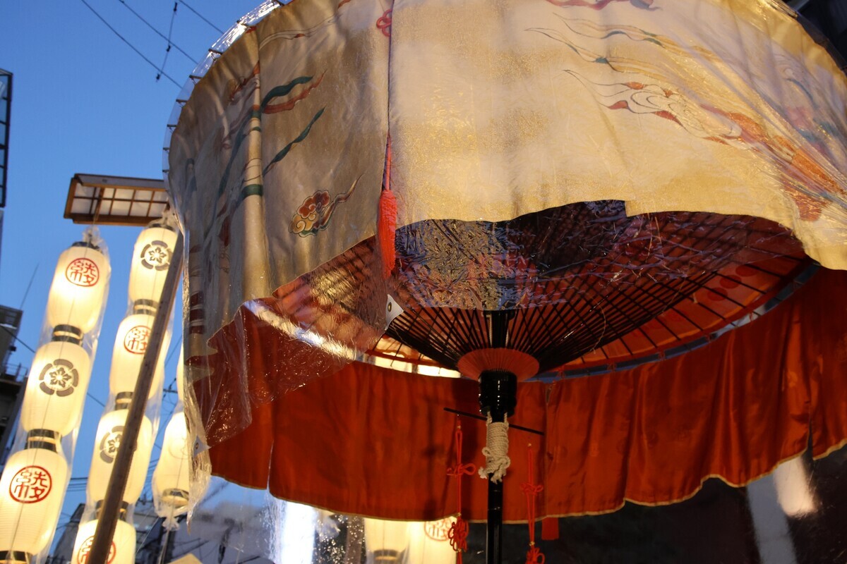 祇園祭前祭・宵山の後半戦、夕暮れ時、山鉾の提灯に灯が点るころ。